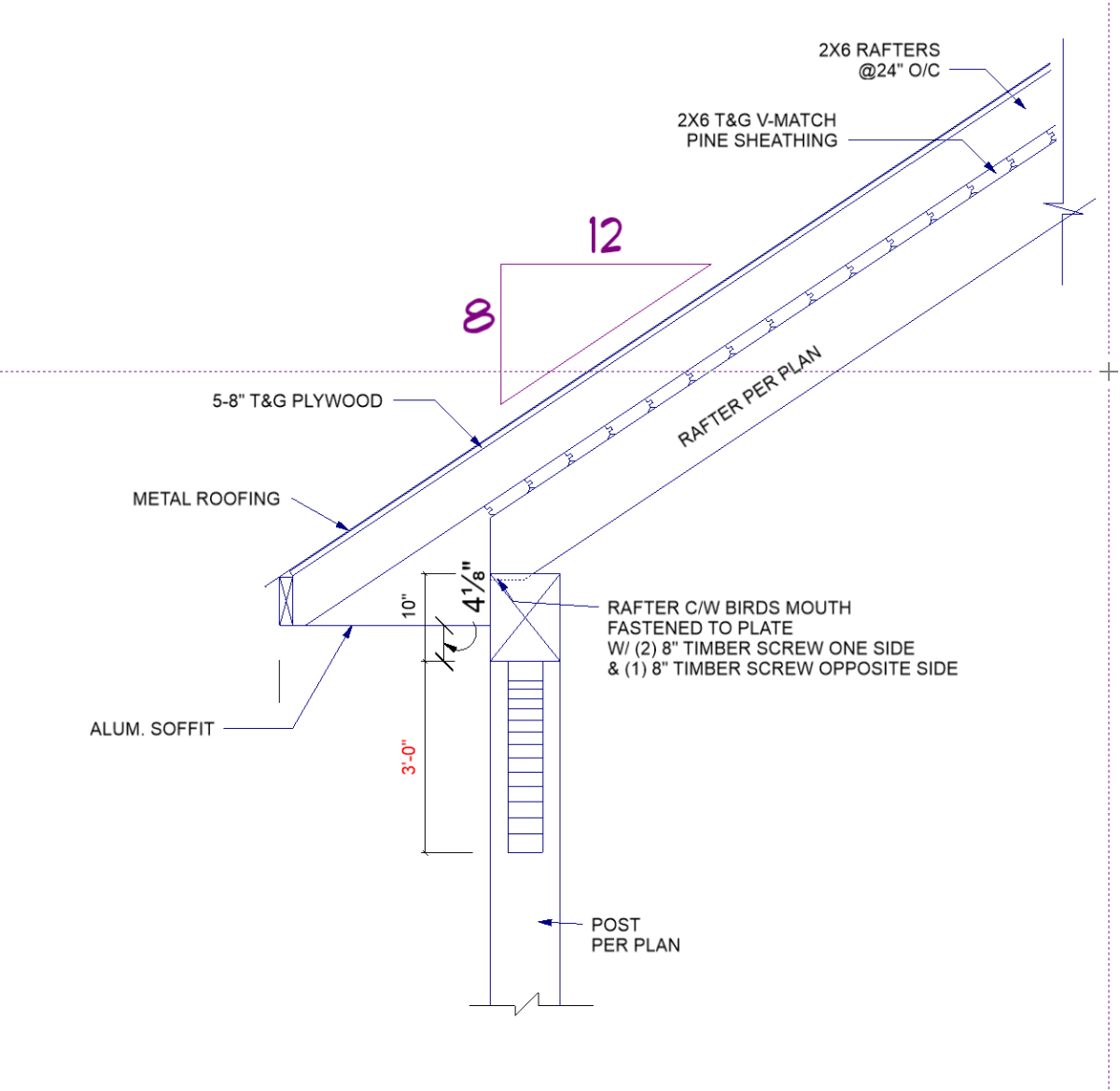 I am working on a timber frame pavilion, where the roof is to be constructed of 6" timbers, with 1 1/2" T&G V-match, then 2x6 rafters, then 5/8" sheathing, then standing seam metal. The reason for doing 2x6 rafters above the V-match is to raise the height of the roof so that the timber is visible below the soffit. See the screenshot for my detail.